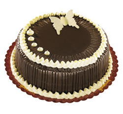 CHOCO CARAMEL DECADENCE CAKEChoco Caramel Cake filled with vanilla butter creme and creamy caramel filling and iced with choco fudge frosting, topped with vanilla butter creme and decorated with a gumpaste butterfly topper. From Goldilocks. |