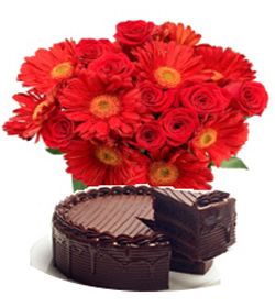 Sweet and thoughtful12 red roses and 12 red gerbera in a bunch type bouquet that shows how thoughtful are you and a chocolate cake for your sweetness. |