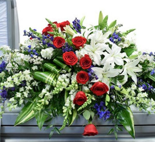 Casket Spray Red White & blueFor a military or private funeral, this classic casket spray is a proud and patriotic way to pay lasting tribute to a loved one's esteemed memory, life of service and dedication to freedom. This piece is designed with blue delphinium, white larkspur, white lilies, white snap dragons, red freedom roses and variegated ti leaves. |