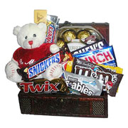 Bear w/ ChocolateHeart shape Fererro Rocher, Toblerone, M&M and other item of chocolate. Total 10 items foreign chocolate with 14" Teddy Bear with i love you pilow. |