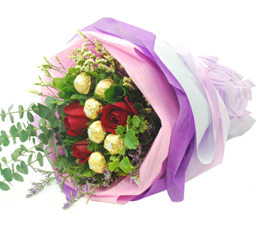 Ferrero Rocher Hand BouquetFerrero Rocher Hand Bouquet . 6 Stalks Red Roses + 9 pcs Ferrero Rocher . |