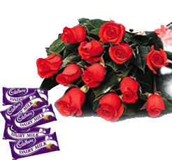 Flowers N ChocolatesBunch of 12 Red Roses with 5 Cad-bury milk Chocolates.(40 grm each). |