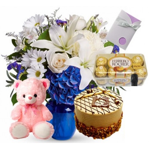 You Are My Everything8'' Pink or Brown Or White Teddy BearWine 16pcs. Ferrero Rocher Chocolate Greeting Card Black Forest Cake OR Mango CAke white malaysian,12 white roses,1 stick white stargazer ,white alstromeria purple statice and blue hydrangea in a Vase. |