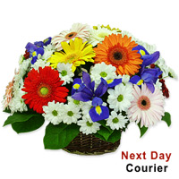 FiestaIt is a riot of colours with this wholesome arrangement of Daises, Gerberas and Blue Iris complemented with green foliage. This wonderful arrangement comes in a beautiful basket. Note: Due to unavailability of seasonal flowers, some flowers may be substituted keeping the colour theme and the value consistent with the original product.It is a riot of colours with this wholesome arrangement of Daises, Gerberas and Blue Iris complemented with green foliage. This wonderful arrangement comes in a beautiful basket. Note: Due to unavailability of seasonal flowers, some flowers may be substituted keeping the colour theme and the value consistent with the original product. |