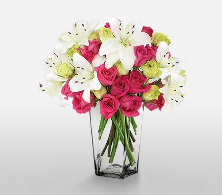 Broadways BestBursting with style, color and extravagance, this luxurious arrangement featuring gorgeous pink and green roses surrounded by stems of white lilies arranged in a glass vase, will add charm and elegance to your loved ones day. |