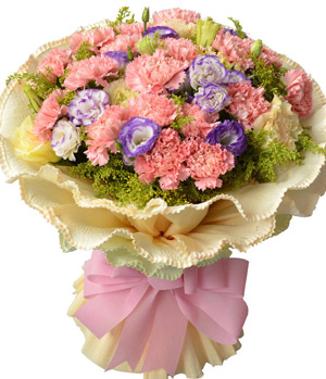 Flowers For Mom19 selected pink carnations, solidago canadensis and eustoma(or similar flora), light yellow edge curl paper round packing. |