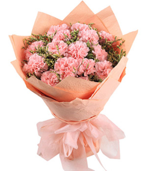 Mother`s kissPink carnatons 11 stems with gypsophila and green foliages decorated. Pink paper wrapped and ribbon tied. Available for bouquet for mother, get well. |