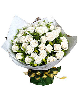 Perhaps Love33 white roses with white, green cotton, gold ribbon packaging, round hand-tied bouquet, finished with gift wrap and ribbon. |