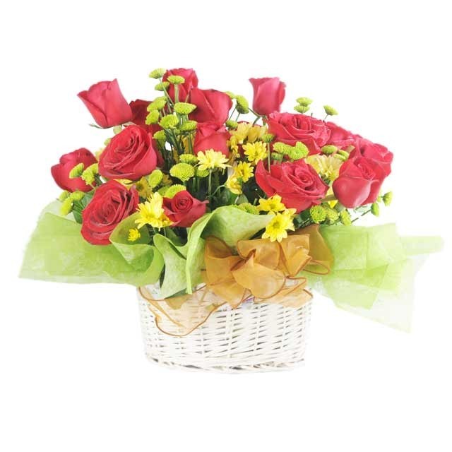 UNTAMED BEAUTY24 Red Roses and filler in basket Bunch of Roses make up this basket of blooms, an ideal gift for any occasion with its cheerful appearance. |