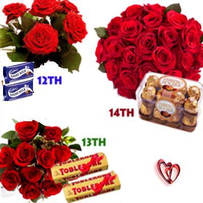 Everlasting Non Stop LoveExpress your everlasting love to your loved ones on any special ocassions with this 3 Days Serenade which includes : Day 1 feb 11 : Bunch of 6 Red Roses along with 2 60gm cadbury Chocolate Bars / Day 2 feb 12: Bunch of 12 Red Roses along with Toblerone Chocolate Bars (Net Weight : 600 Gms). / Day 3 feb 13 : Bunch of 24 Red Roses along with Box of Ferrero Rocher Chocolates (Net Weight : 200 Gms). / |